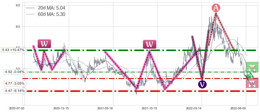 ♘ 支撑价格位4.77,可信任强度61.35%,距离最后交易2022-08-12形成的收盘价格4.92相差 -3.05%