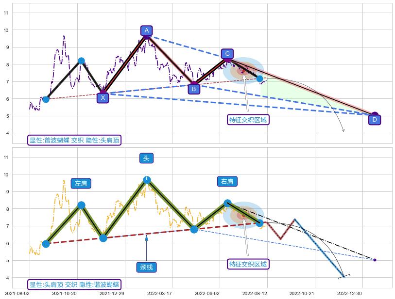 ➣ 未完成【蝴蝶】形态起点X: 2021-11-26, 已到达C点: 2022-06-15, 预测最终D点: 2023-01-18, 共280交易日