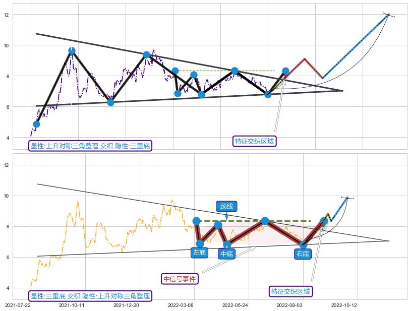 ➢ 三重底属【短级别信号事件】上升对称三角整理属【长级别信号事件】长短周期组合信号事件, 短长事件长度比34.30%