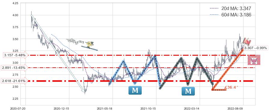 ♘ 支撑价格位3.157,可信任强度57.44%,距离最后交易2022-08-12形成的收盘价格3.340相差 -5.48%