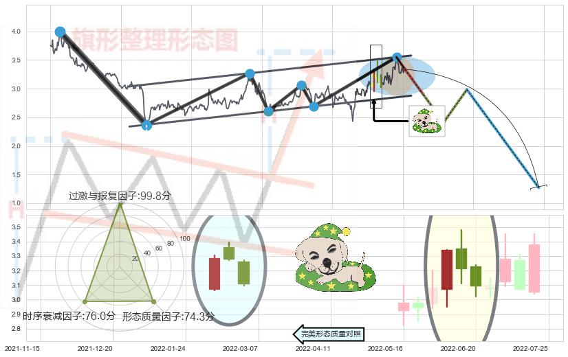 ➣ 下跌镊子线(n形磁铁) + 升旗形临近支撑猜想转换阻力下跌信号叠加后【目标达成率】低,【看空】信号叠加【存续影响大】