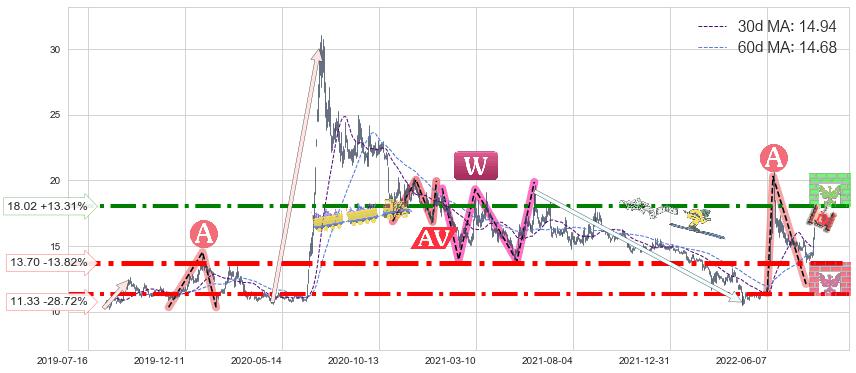♘ 阻力价格位18.02,可信任强度76.28%,距离最后交易2022-08-12形成的收盘价格15.90相差 +13.31%