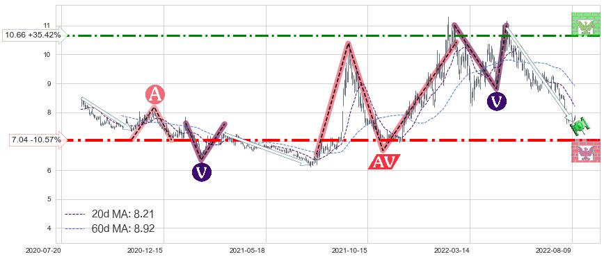 ♘ 支撑价格位7.04,可信任强度80.70%,距离最后交易2022-08-12形成的收盘价格7.87相差 -10.57%