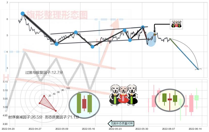 ➢ 下跌镊子线(n形磁铁) 🔜 升旗形支撑破位转换阻力下跌 综合量化分数:42.74 【偏空】