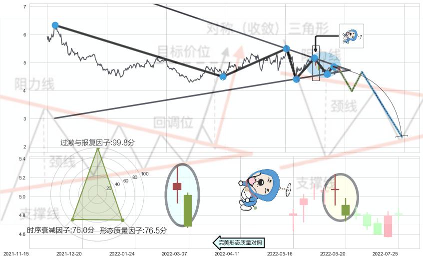 ➣ AI智能: 预测【多空区域上下窄幅震动→价格波动日益狭窄→空方占优】对称三角形中继整理向下突破,预测将在2022-08-01突破颈线, 演变成下降通道