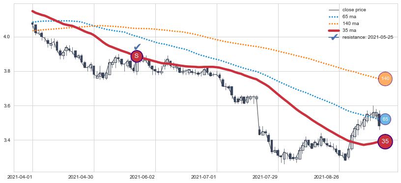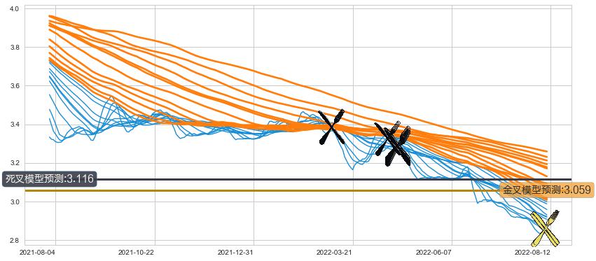 ➣ 35小时均线于(2022-04-22: 3.279)形成【死叉】基于【死叉历史模型】预测死叉后最低波谷价格: 3.083, 死叉后最低价格2.820,已经下跌超出预测最低波谷价格, 预期反弹