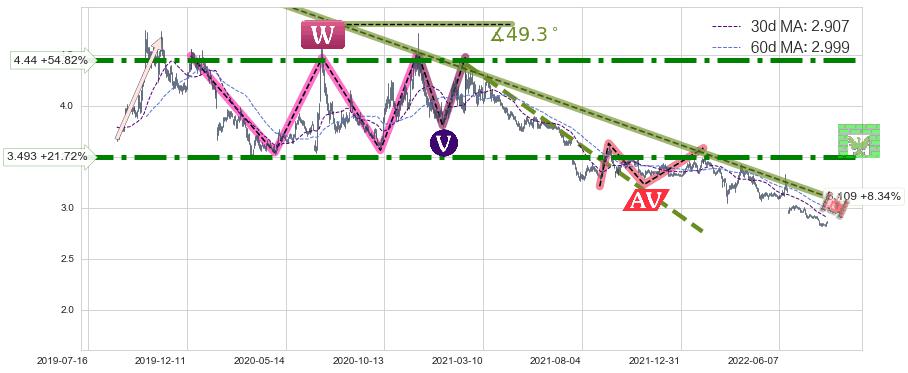 ♘ 阻力价格位4.44,可信任强度95.54%,距离最后交易2022-08-12形成的收盘价格2.870相差 +54.82%