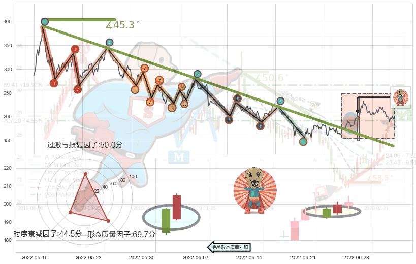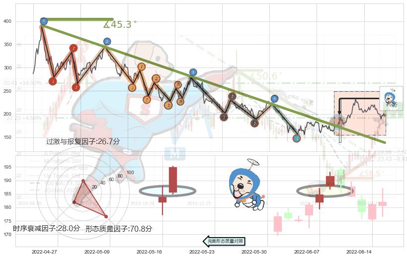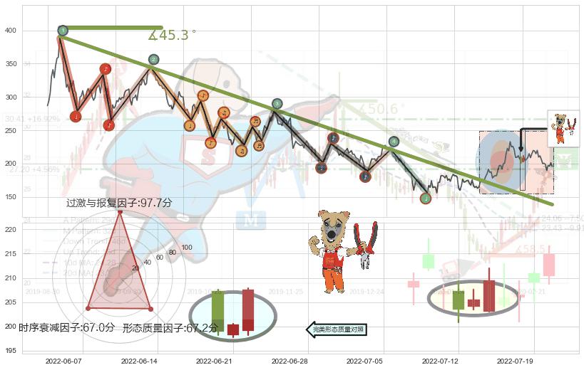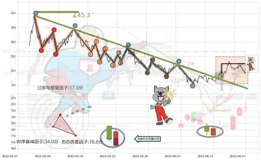 从2021-02-10至2022-04-26,共包含290个交易日,阶段股价下跌-62.52%,阶段股价变动位移路程比: 1 : 11,下跌趋势角度: 45.3