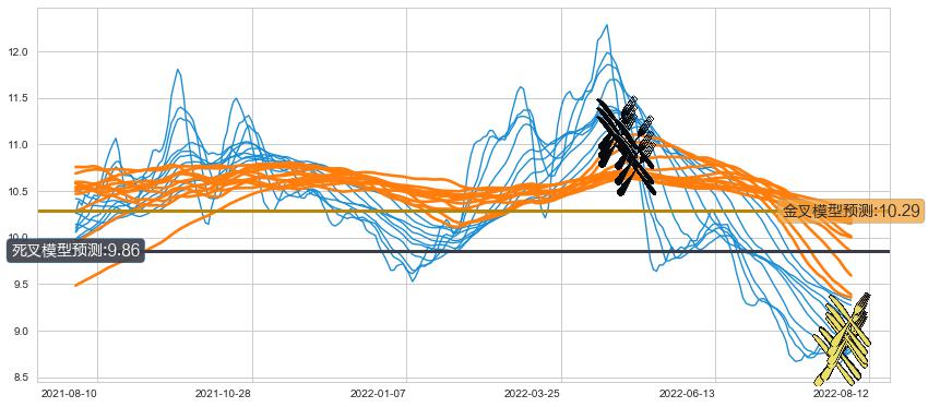 ➣ 45小时均线于(2022-08-11: 9.11)形成【金叉】基于【金叉历史模型】预测金叉后最高波峰价格: 10.59, 金叉后最高价格9.19,尚未达到预测最高波峰价格, 预期继续上涨