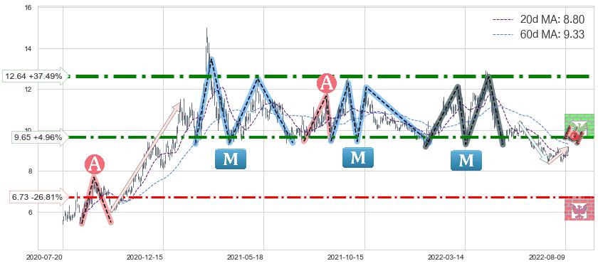 ♘ 阻力价格位12.64,可信任强度95.28%,距离最后交易2022-08-12形成的收盘价格9.19相差 +37.49%