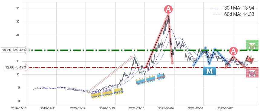 ♘ 阻力价格位19.20,可信任强度70.29%,距离最后交易2022-08-12形成的收盘价格13.77相差 +39.43%
