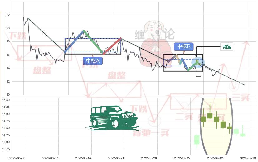 ➢ 【中枢B】:2022-05-24-2022-07-08,中枢由6笔构成,共33交易日, ZG=14.95, ZD=14.84