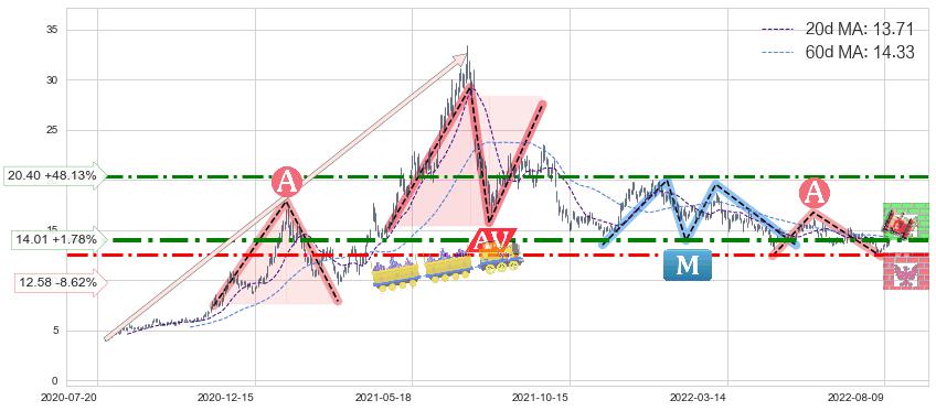 ♘ 阻力价格位14.01,可信任强度79.73%,距离最后交易2022-08-12形成的收盘价格13.77相差 +1.78%