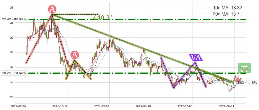 🦴 长线均值回复组合短线趋势跟踪[强阻力信号]2021-09-13-2022-08-11下跌趋势依然成立(下跌趋势跟踪依然存在),短线价格略微上行反弹(均值回复猜想),即将接近下跌趋势提供的未破位阻力价格:13.93。