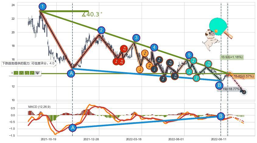♘ 在最后的下跌阶段2021-09-13至2022-08-11,存在 持续未破位的阻力位 ,阻力价格13.93,可信任强度84.69%,其距离最后价格13.77相差 +1.18%