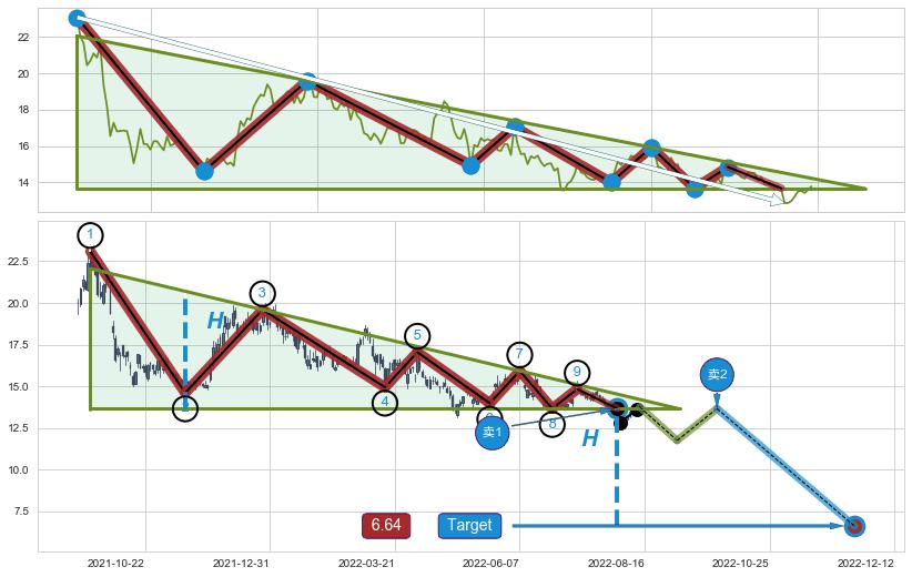 ➢ 【多方力量耗尽,空方打破攻守平衡点】下降三角形中继整理, 已在2022-08-01突破【支撑】颈线 13.67 →演变成下降通道