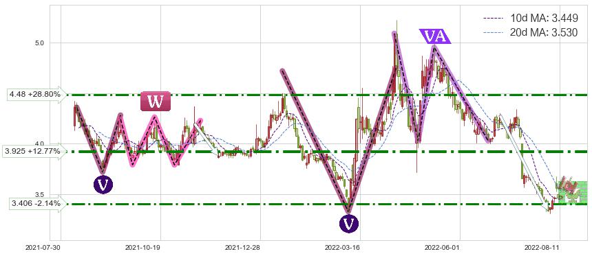 ♘ 阻力价格位3.925,可信任强度79.60%,距离最后交易2022-08-12形成的收盘价格3.480相差 +12.77%