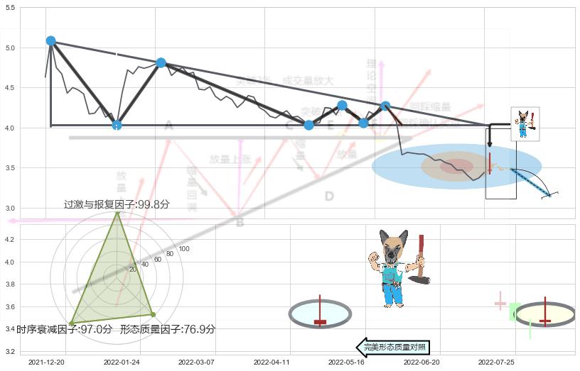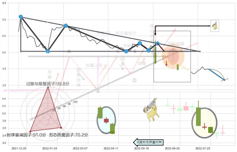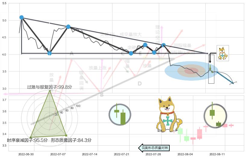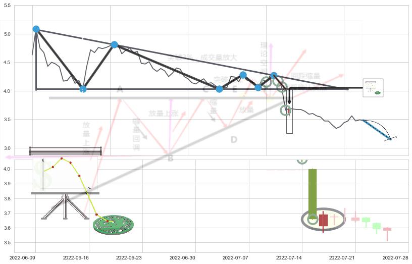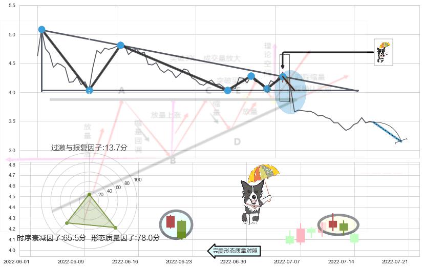 ➢ 【多方力量耗尽,空方打破攻守平衡点】下降三角形中继整理, 已在2022-07-15突破【支撑】颈线 4.03 →演变成下降通道
