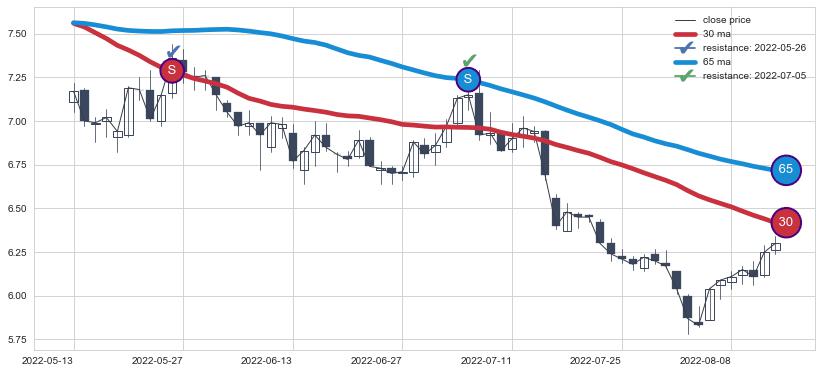 ➢ 65小时均线于(2022-04-20: 7.60)形成【死叉】基于【死叉历史模型】预测死叉后最低波谷价格: 7.20, 死叉后最低价格5.83,已经下跌超出预测最低波谷价格, 预期反弹