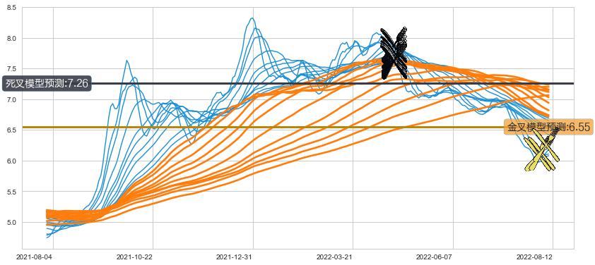 ➣ 70小时均线于(2022-04-20: 7.60)形成【死叉】基于【死叉历史模型】预测死叉后最低波谷价格: 7.22, 死叉后最低价格5.83,已经下跌超出预测最低波谷价格, 预期反弹