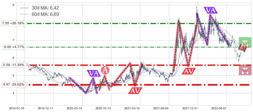 ♘ 阻力价格位6.60,可信任强度44.43%,距离最后交易2022-08-12形成的收盘价格6.30相差 +4.77%
