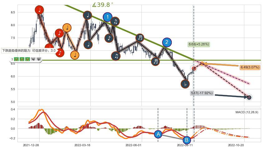 ♘ 阻力价格位6.06,可信任强度66.72%,距离最后交易2022-08-12形成的收盘价格6.30相差 -3.83%