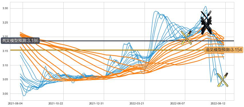 ➢ 34小时均线于(2022-07-13: 3.242)形成【死叉】基于【死叉历史模型】预测死叉后最低波谷价格: 3.193, 死叉后最低价格3.000,已经下跌超出预测最低波谷价格, 预期反弹