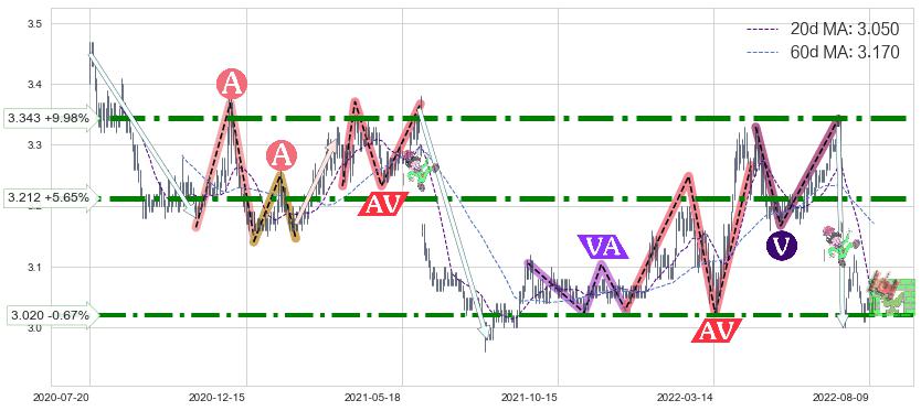 ➣ 收盘价(2022-07-20: 3.080 )→回踩→第二根k线高点(2022-07-15: 3.040 )