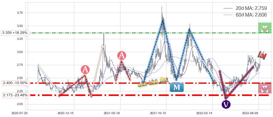 ♘ 阻力价格位3.359,可信任强度53.50%,距离最后交易2022-08-12形成的收盘价格2.840相差 +18.29%