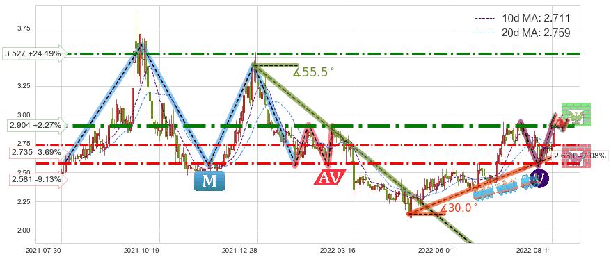 ♘ 阻力价格位2.904,可信任强度88.28%,距离最后交易2022-08-12形成的收盘价格2.840相差 +2.27%