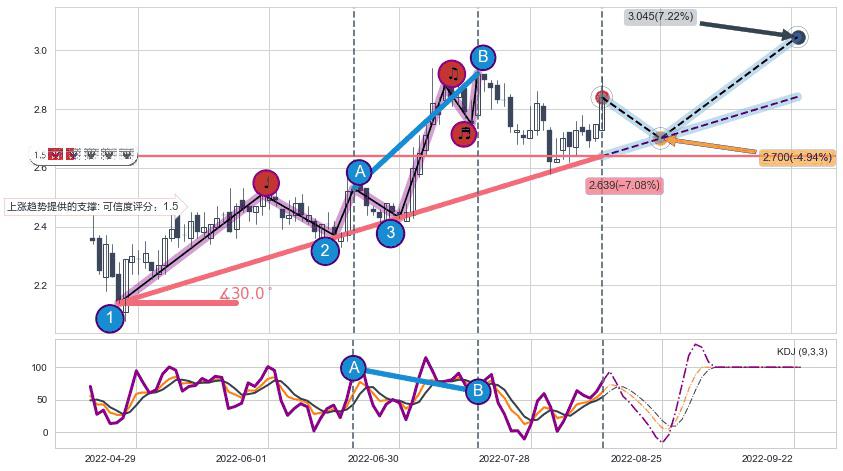♘ 在最后的上升阶段2022-04-26至2022-07-22存在 持续未破位的支撑位 ,支撑价格2.639,支撑可信任强度60.50%,其距离最后价格2.840相差 -7.08%
