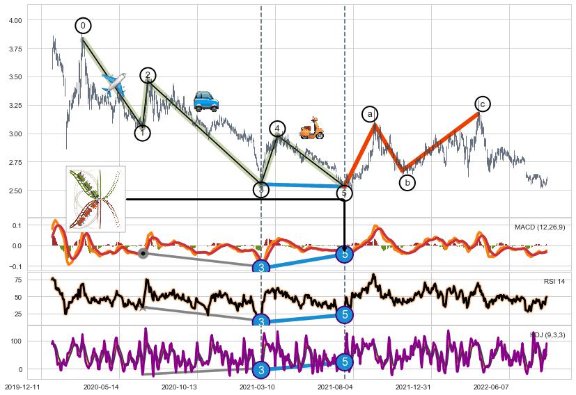 ➣ 第一, 三, 五浪下跌动能逐渐【衰弱变小】,趋势呈现不稳迹象