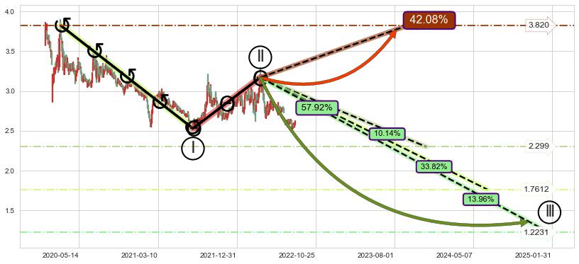 ➣ 调整浪已超过预测的c点位置,后续大趋势循环浪继续下跌概率57.92%,谨慎做多