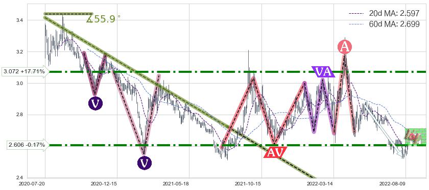 ♘ 阻力价格位3.072,可信任强度75.01%,距离最后交易2022-08-12形成的收盘价格2.610相差 +17.71%