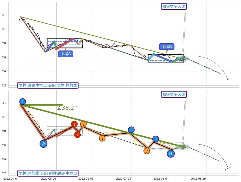 ➣ 【中枢B】:2022-07-15-2022-08-11,中枢由4笔构成,共20交易日, ZG=2.600, ZD=2.550