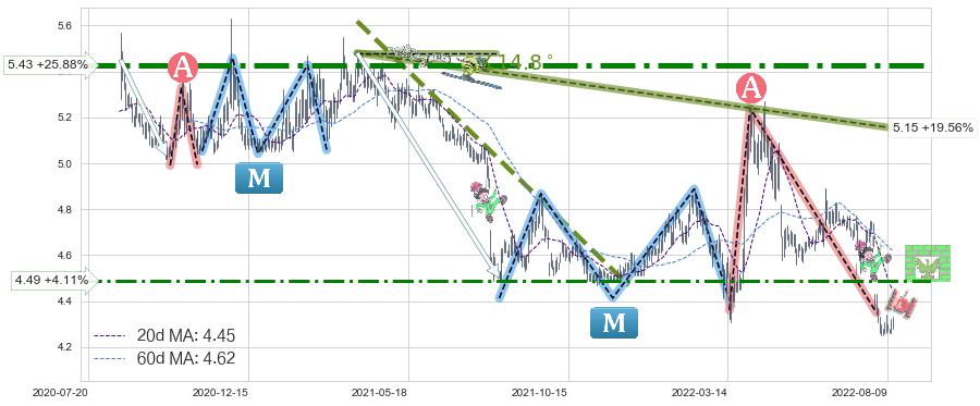 ♘ 阻力价格位4.49,可信任强度66.75%,距离最后交易2022-08-12形成的收盘价格4.31相差 +4.11%