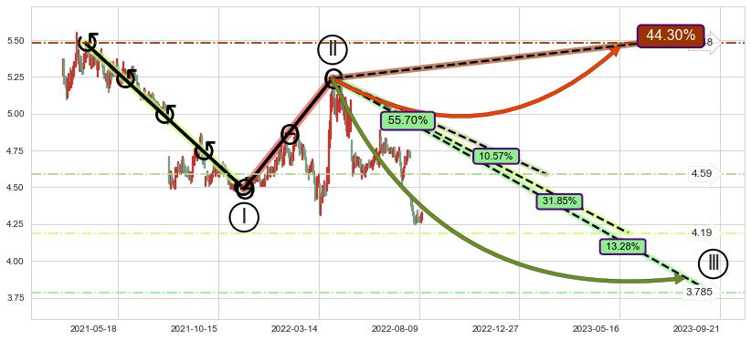 ➣ 循环浪继续向下【平均值】位置(2023-05-29, 4.19),匹配聚类样本比例57.18%, 可能性概率31.85%