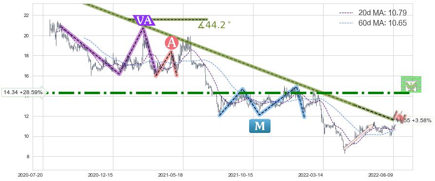 🦴 长线均值回复组合短线趋势跟踪[强阻力信号]2020-08-03-2022-05-20下跌趋势依然成立(下跌趋势跟踪依然存在),短线价格略微上行反弹(均值回复猜想),即将接近下跌趋势提供的未破位阻力价格:11.55。