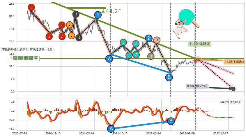 ♘ 在最后的下跌阶段2020-08-03至2022-05-20,存在 持续未破位的阻力位 ,阻力价格11.55,可信任强度83.83%,其距离最后价格11.15相差 +3.58%
