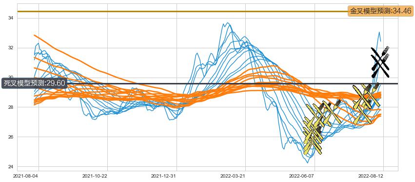 ➣ 13小时均线于(2022-08-11: 30.75)形成【死叉】基于【死叉历史模型】预测死叉后最低波谷价格: 29.12, 死叉后最低价格29.87,尚未达到预测最低波谷价格, 预期继续下跌
