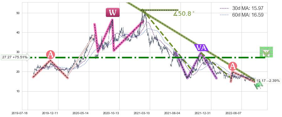 ➣ 【仅预测突破】最后价格:15.54与预测突破价格:16.67→【空间临近】后续最小【整理】第一目标价格→(2022-10-11: 37.51 )