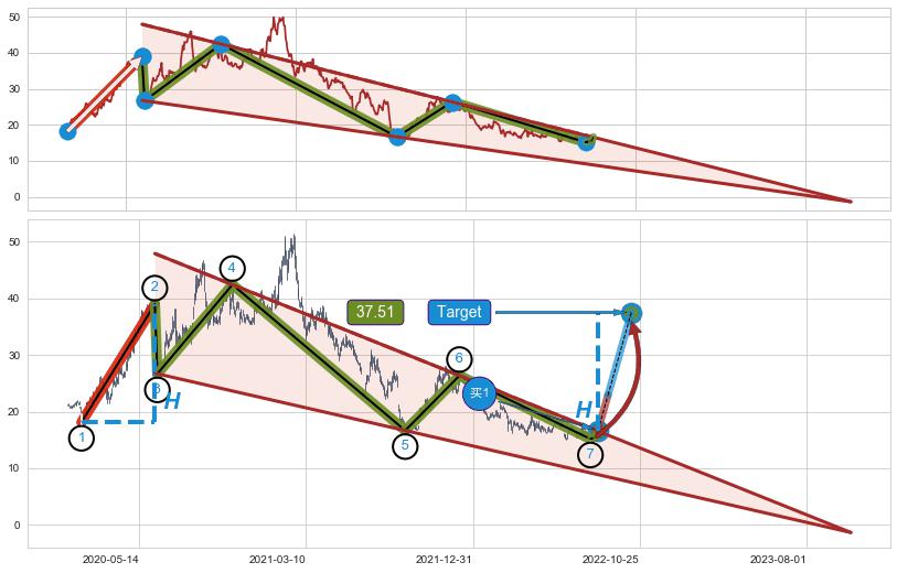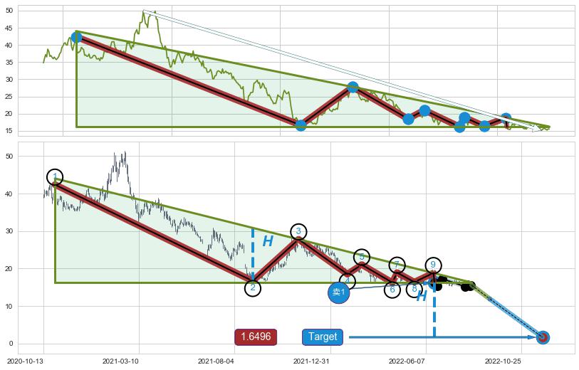 ➣ 最小中继整理跌幅→𝐇: 14.60 (下侧直角边第一支撑点②与斜边垂直距离)