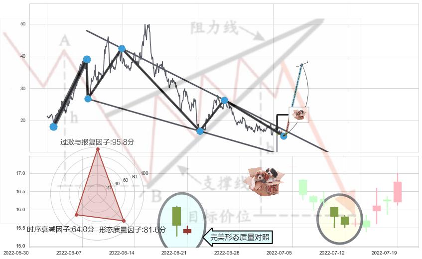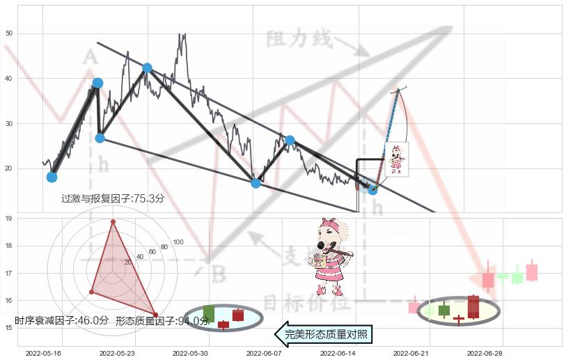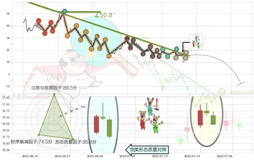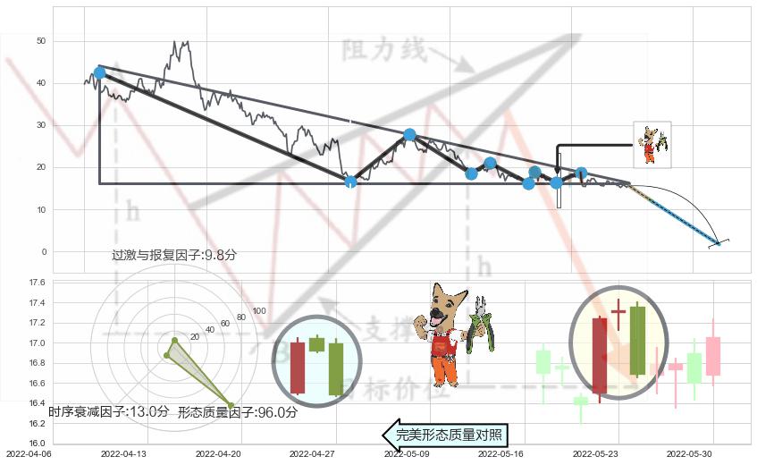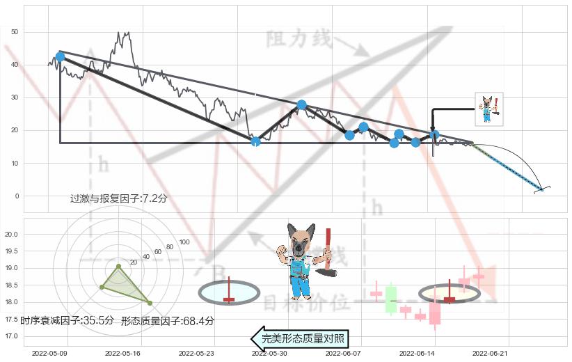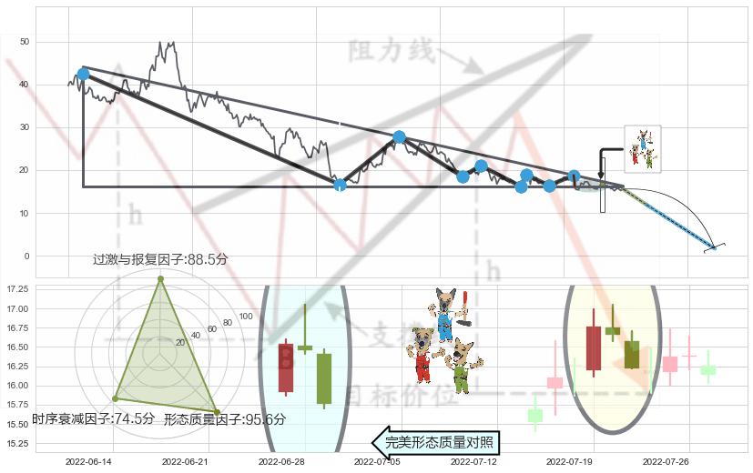 ➢ 【多方力量耗尽,空方打破攻守平衡点】下降三角形中继整理, 已在2022-06-20突破【支撑】颈线 16.25 →演变成下降通道