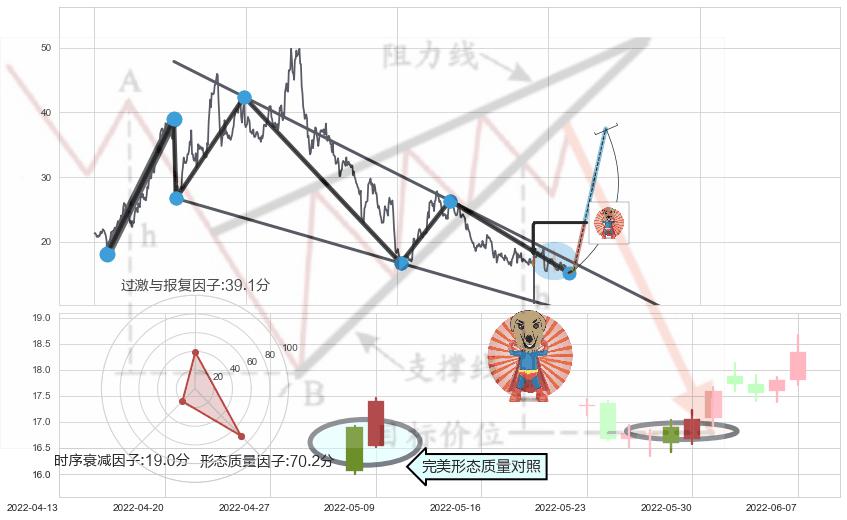 ➣ 锤头线(锤子线) + 降楔型临近阻力猜想转换支撑上涨信号叠加后【目标达成率】中等,【看多】信号叠加【存续影响中等】