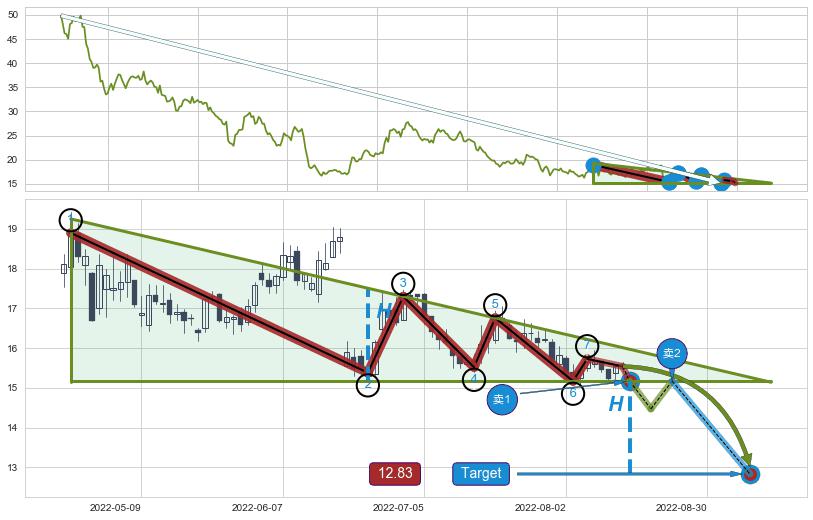 ➣ 【未确认突破,预测即将形成突破】下降三角形整理起点:2022-04-20, 预测突破点:2022-08-15,形态共80交易日