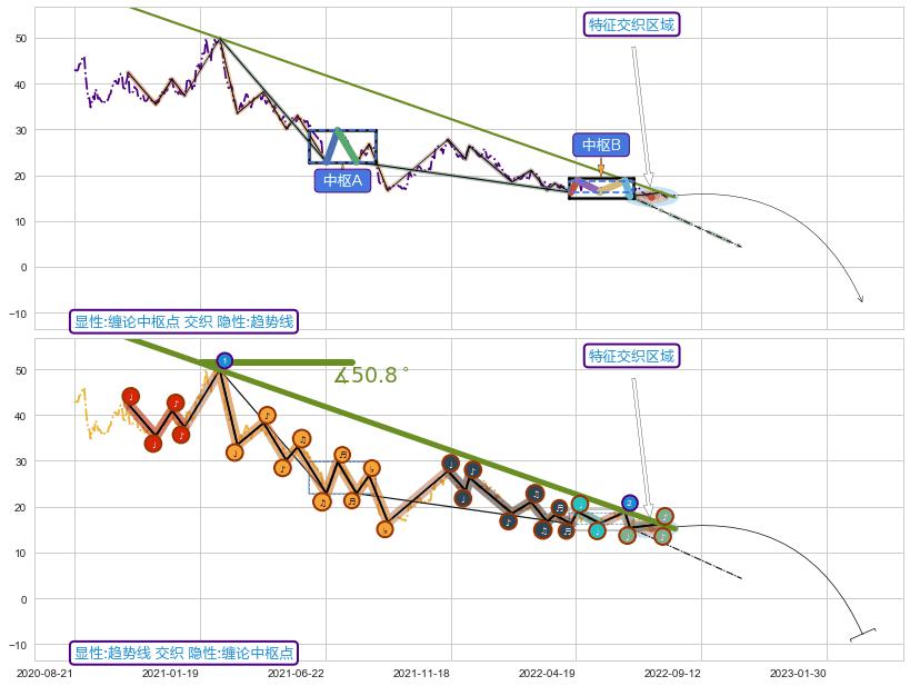 ➣ 缠论中枢点:猜想破位中枢B后持续下拉 → 下跌 → 破位中枢B支撑 → 持续趋势跟踪