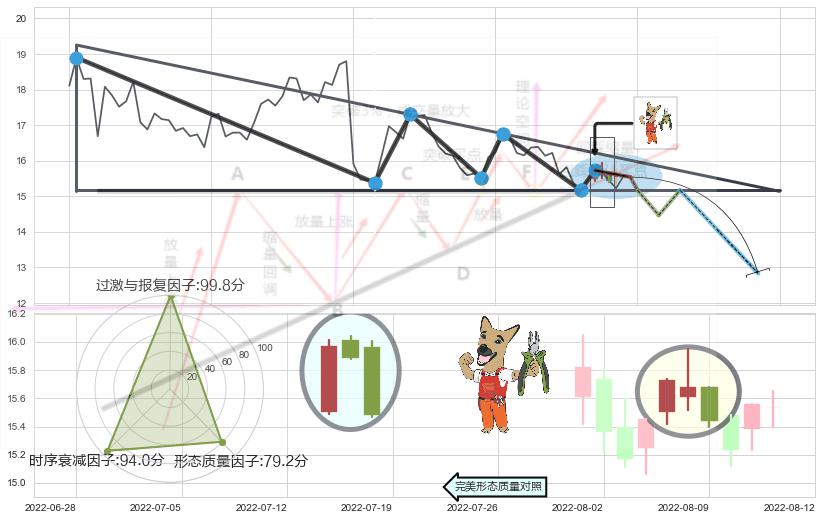 ➢ AI智能: 预测【多空防线逐步靠近→双方接火→空方占优】下降三角形中继整理向下突破,预测将在2022-08-15突破颈线, 演变成下降通道