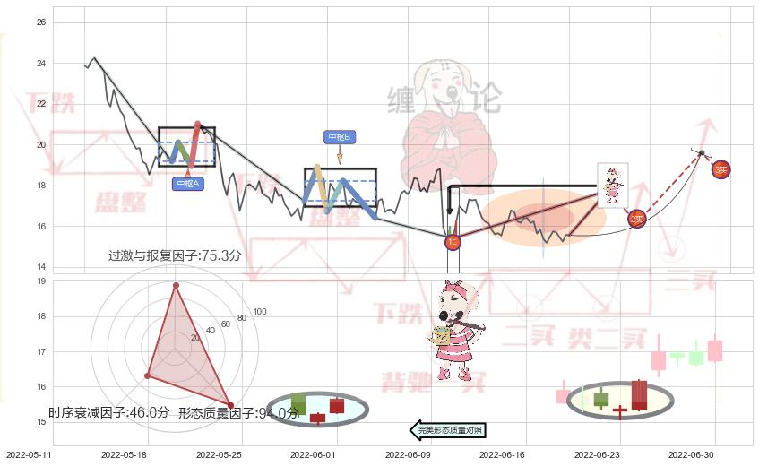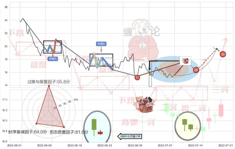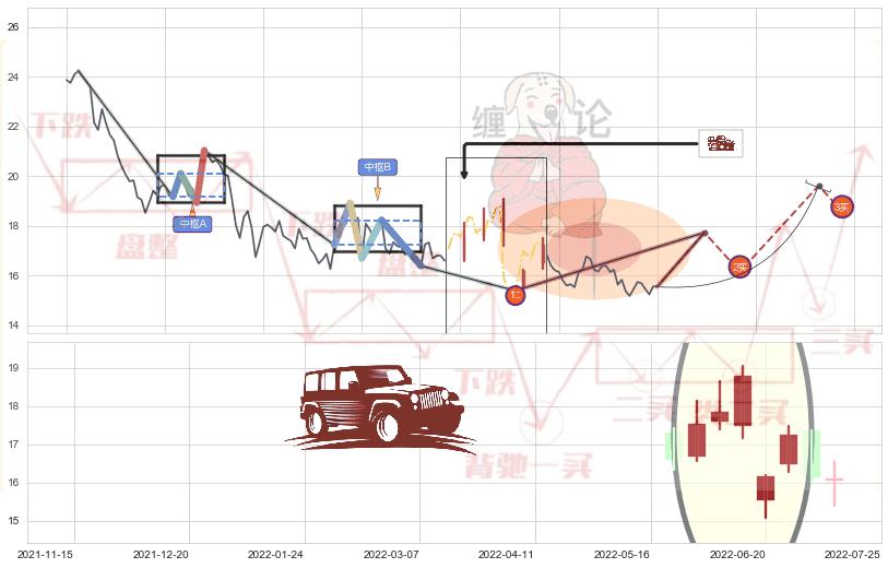 ➣ 【中枢B】:2022-04-14-2022-05-19,中枢由5笔构成,共23交易日, ZG=18.22, ZD=17.22