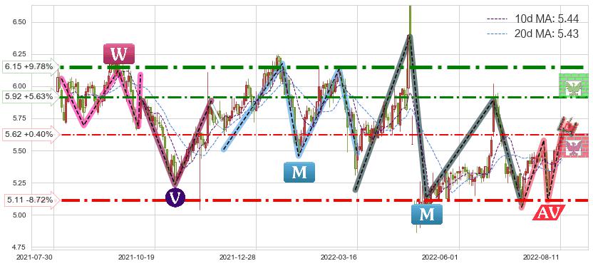 ♘ 阻力价格位5.92,可信任强度58.66%,距离最后交易2022-08-12形成的收盘价格5.60相差 +5.63%