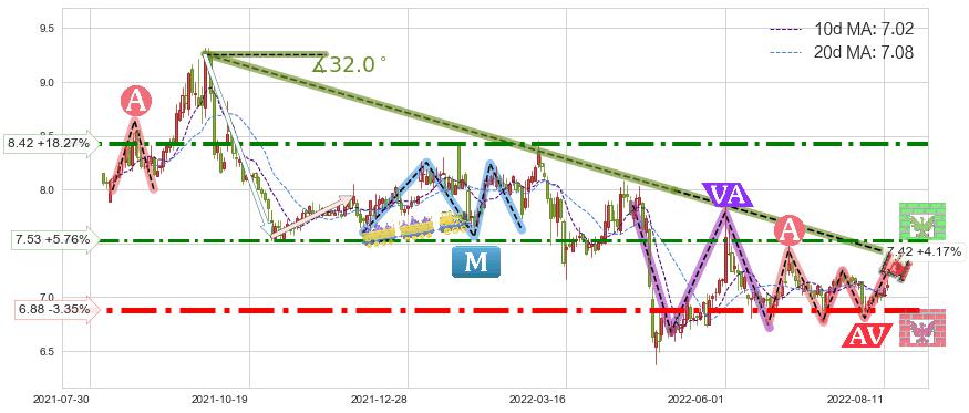 ♘ 阻力价格位7.53,可信任强度67.19%,距离最后交易2022-08-12形成的收盘价格7.12相差 +5.76%